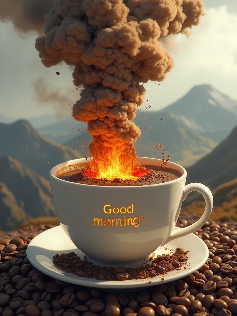 The surreal artistic composition depicts a white coffee cup filled with a dark brown liquid coffee mixture, creating the illusion of a volcanic eruption. Above the surface of the coffee rises a detailed swirling cloud of dark red-brown color, imitating smoke and ash. Inside the coffee, a bright orange-red core imitates lava, enhancing the volcanic effect. The cup, located in the center, stands on a white saucer surrounded by an abundance of roasted coffee beans in various shades of brown. The words “Good morning” are written in golden orange letters on the surface of the cup. The background depicts a mountain landscape, blurred and muted by s...