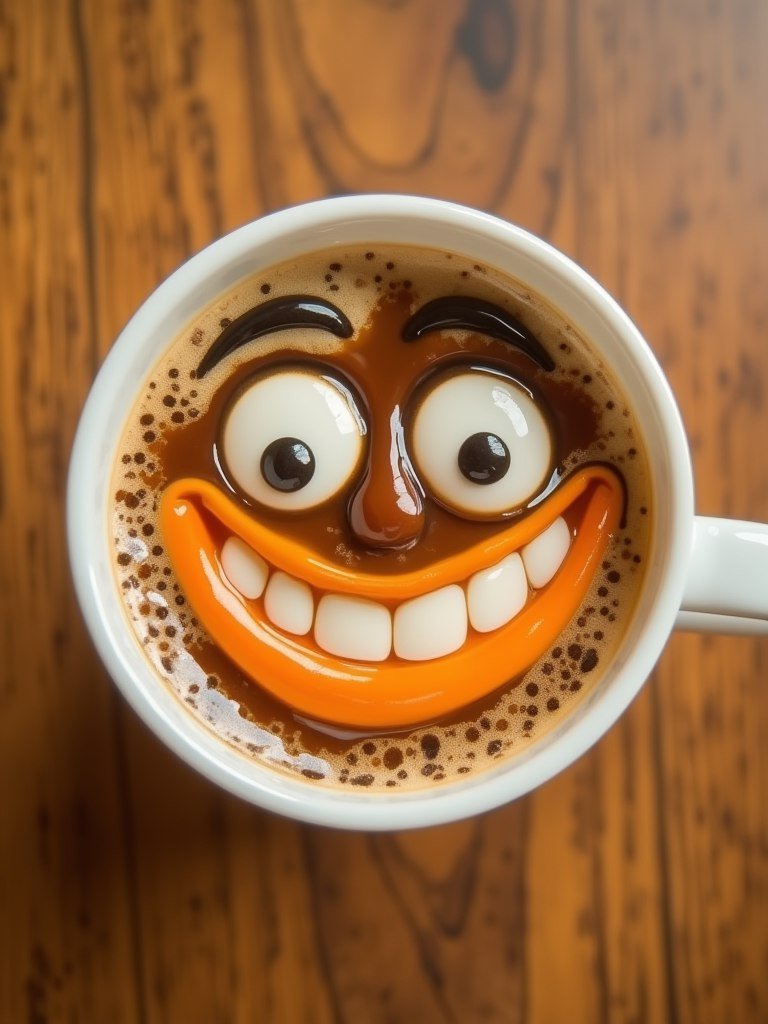 Забавный персонаж оживает прямо из чашки кофе! Уникальное фото крупным планом демонстрирует кофейный напиток, превращенный в милого и жизнерадостного мультипликационного героя. Насыщенный коричневый цвет кофе формирует очаровательное лицо с большими выразительными глазами, сияющими белизной и окруженными черными зрачками. Огромная улыбка оранжевого цвета, украшенная ровными белоснежными зубами, доминирует в нижней части чашки, излучая невероятный позитив и хорошее настроение. Белая чашка с выделяющейся ручкой является идеальным холстом для этого необычного преображения. Размытый фон из текстуры дерева теплых коричневых оттенков создает приятный контраст с яркими цветами чашки. Рассеянное освещение придает напитку глянцевый блеск, усиливая визуальный эффект. Композиция выстроена по центру, привлекая все внимание к преувеличенным чертам анимированной чашки кофе и чистому стилю изображения. Эта работа вызывает ощущение игривости радости и даже легкой сюрреалистичности или юмора, вдохновленное эстетикой поп-арта. Прекрасная иллюстрация для тех, кто любит позитив и необычные визуальные решения! Это не просто фотография чашки кофе это источник вдохновения и хорошего настроения