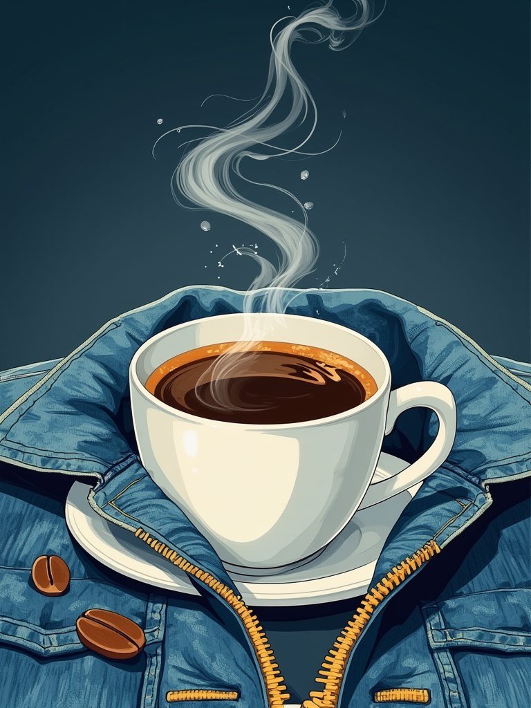 Steaming coffee in a white porcelain cup, brown coffee fills the cup, contrasting against the clean white rim, the coffee cup is positioned centered. The cup is "zipped" up inside a faded blue denim jacket. A golden zipper runs vertically down the center of the image, the zipper is partly unzipped, revealing the coffee cup. Wisps of steam curl upwards from the coffee, suggesting its warmth. A small white saucer and a coffee bean on the left side, balancing the composition. The background is a gradient of deep, dark blues. The composition has a close-up perspective, drawing the viewer's attention to the details of the coffee and the clothing. ...