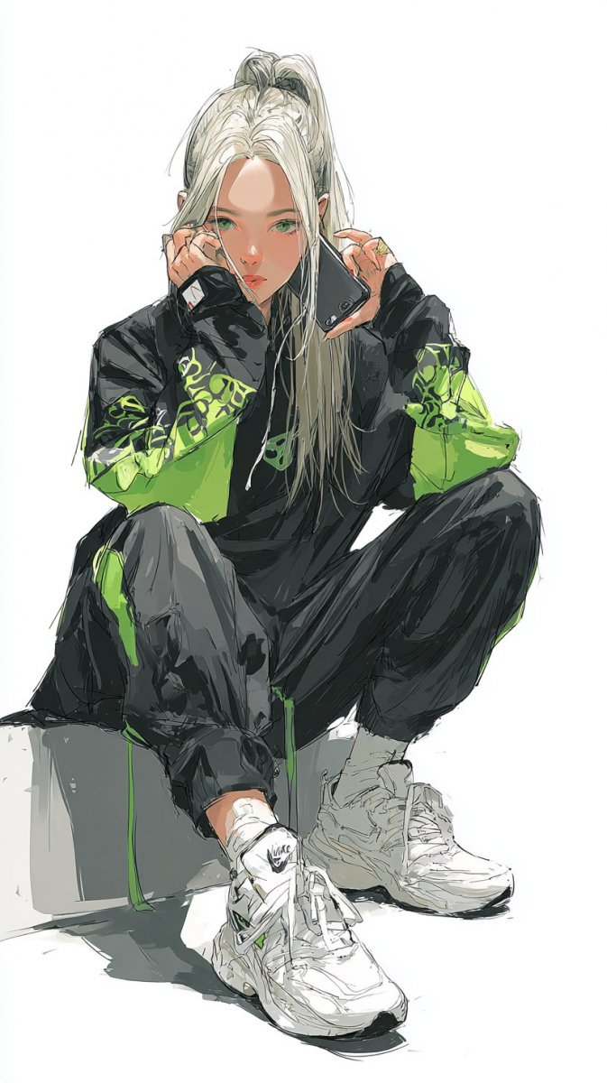 Яркая и дерзкая иллюстрация в технике чернил изображает современную модную модель. На ней стильный спортивный костюм сочетания розового и чёрного цветов, акцентированный неоново-зелёными полосами, дополненный белыми кроссовками. Длинные светлые волосы собраны в высокий конский хвост, придавая образу динамичности и энергии. Модель сосредоточенно держит телефон у уха обеими руками, создавая ощущение моментальной связи с миром. Выразительный взгляд и общая стилистика передают атмосферу смелости и уверенности в себе. Использование неоновых оттенков добавляет изображению футуристичности и привлекательности, выделяя модель на фоне абстрактного пространства. Это визуальное воплощение современной моды, сочетающее в себе спортивный стиль с элементами уличной культуры и ярким акцентом на индивидуальность. Графичность исполнения подчеркивает детали костюма и аксессуаров, делая изображение запоминающимся и стильным. Вся композиция пронизана ощущением движения и динамизма, отражая ритм современной жизни и стремление к самовыражению через моду. Это не просто иллюстрация – это заявление о стиле и уверенности в себе