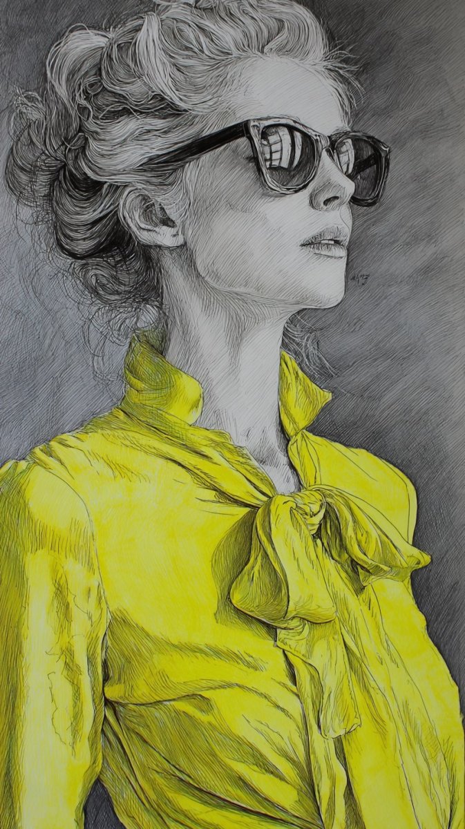 illustration, ink drawing, fashion model, neon colors posing in studio, gray background, wearing bright yellow blouse with long sleeves, high neckline, sunglasses, sleek updo.