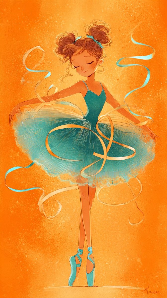 Завораживающий образ юной балерины, оживший на бумаге в энергичной акварельной манере. Это не просто рисунок – это искрящийся танец красок и движений, воплощенный в игривом стиле мультфильма. Грациозная девушка в небесно-бирюзовом пачке и пуантах кружится в вихре лент, словно ловя солнечные лучи. Ее лицо выражает неподдельную радость и беззаботность – взгляд полон задора, а губы тронуты легкой улыбкой. Волосы, аккуратно собранные в игривые хвостики, лишь подчеркивают ее юность и непосредственность. Фон выполнен в сочных оранжевых тонах, создавая ощущение тепла и летнего дня. Кажется, будто можно услышать легкую музыку и почувствовать аромат цветов. Это произведение искусства – настоящий праздник для глаз, наполненный легкостью, изяществом и детской непосредственностью. Оно словно приглашает зрителя окунуться в мир волшебства и танца, где нет места печали и унынию. Яркие цвета и динамичная композиция создают ощущение движения и энергии, а детализированная проработка персонажа позволяет почувствовать его характер и настроение. Это прекрасный пример того, как простые линии и акварельные краски могут создать удивительно живой и эмоциональный образ. Идеально подойдет для тех, кто ценит оригинальность и креативность в искусстве