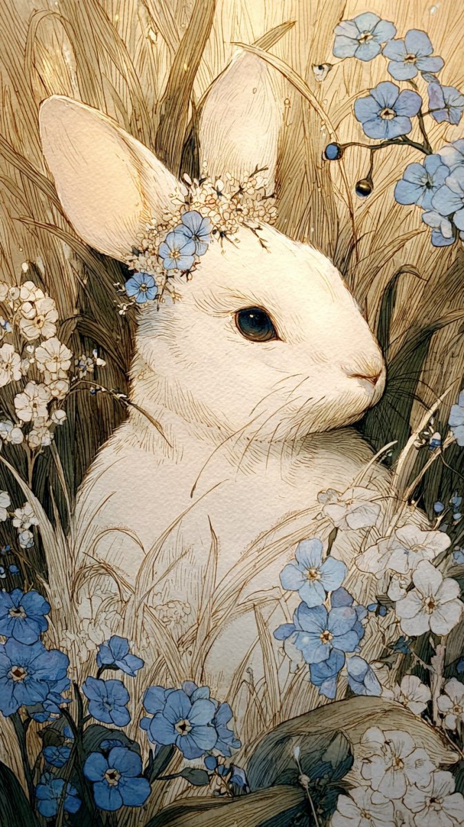 Watercolor illustration of a fluffy white bunny wearing a tiny floral crown, nestled amongst blooming forget-me-nots, gentle light, soft pastel colors, delicate brushstrokes.
