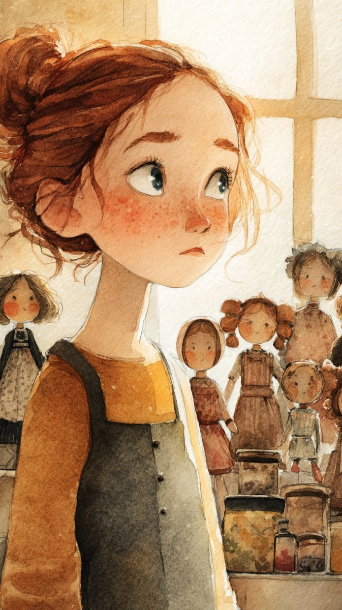 Watercolor illustration of a little girl with pigtails and freckles, gazing at a collection of antique porcelain dolls displayed in a sunlit window, nostalgic feeling, muted palette, expressive brushstrokes.