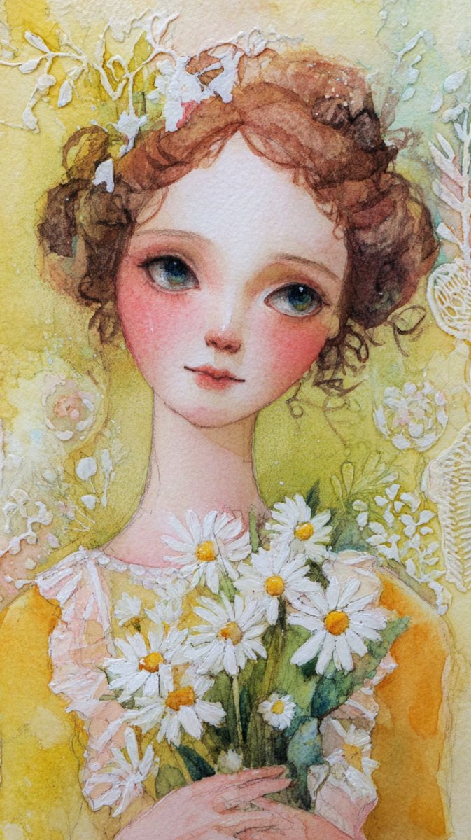midjourney Нежная акварель: Тilda с ромашками в ладонях и нежным взглядом. Картинка из нейронной сети Миджорни