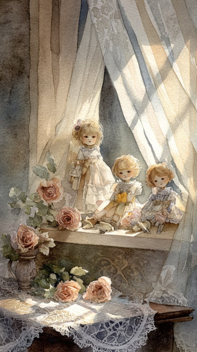 Sweet watercolor scene featuring a portrait porcelain dolls arranged on an antique wooden table adorned with dried roses and vintage lace, dappled sunlight filtering through sheer curtains, subtle watercolour washes creating depth.