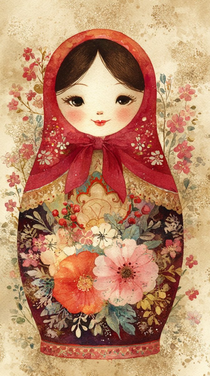Sweet watercolor depiction of a Russian Matryoshka doll with a cheerful smile peeking out from beneath a vibrant red headscarf, surrounded by blossoming cherry branches on an antique parchment-toned background --style expressive