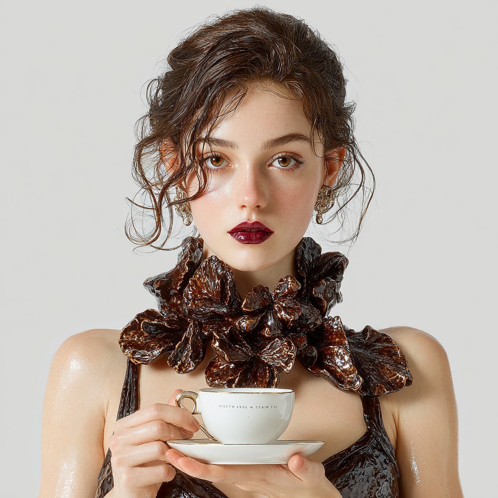 Изящная скульптура молодой женщины с фарфоровой кожей и большими выразительными карими глазами, воплощающая гармонию вкуса и красоты. Её волосы, искусно выполненные из тёмного шоколада, мягко струятся по плечам, обрамляя спокойное лицо. На губах – насыщенный бордовый оттенок, идеально сочетающийся с глубоким цветом кофе в белоснежной фарфоровой чашке, которую она бережно держит в руках. Вокруг её шеи располагается декоративное 'ожерелье' из обжаренных кофейных зёрен, завершающее сюрреалистическую композицию на тему кофе. Трёхмерный эффект создаётся благодаря взаимодействию волос и кофейных зёрен, а тонкий топ с тонкими бретельками добавляет образу лёгкости и воздушности. Использование чистого белого фона усиливает контраст и акцентирует внимание на центральном объекте. Мягкое и равномерное освещение подчеркивает текстуру волос, кожи и кофейных зёрен, создавая ощущение гладкости и полированности. Вся работа выполнена в чистом, отшлифованном и слегка сюрреалистичном стиле, напоминающем рекламу премиум-класса или произведение искусства. Чрезвычайно высокий уровень детализации с упором на реализм передает спокойное и привлекательное настроение, акцентируя внимание на чувственном наслаждении от кофе. Общее впечатление – элегантность и стиль, наполненные тонкими деталями и тёплыми коричневыми оттенками, создающими атмосферу уюта и изысканности. Это визуальное воплощение кофейной симфонии, где каждая деталь продумана до мелочей