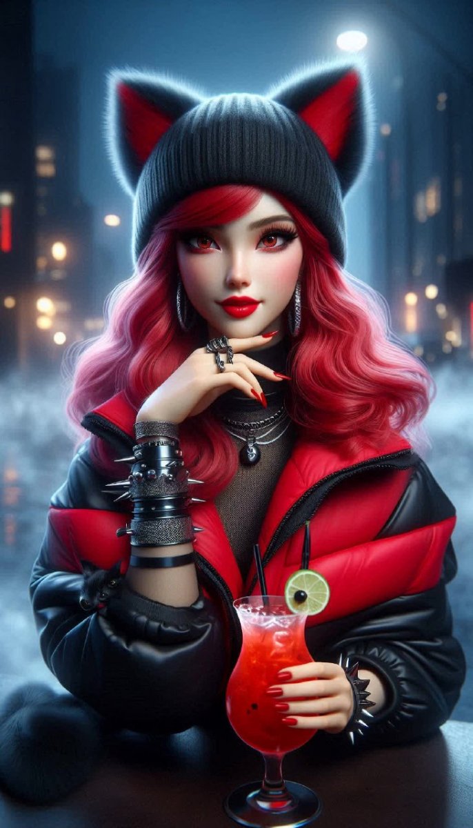 #5. a professional photo of a predatory red-haired vampire girl wearing a black-red down jacket, massive metal bracelets and a black choker – beanie hat with pointed ears, bright red lips, fiery cocktail in hand, foggy black night city backdrop, black demonic cat at her feet, demon wings #role_real