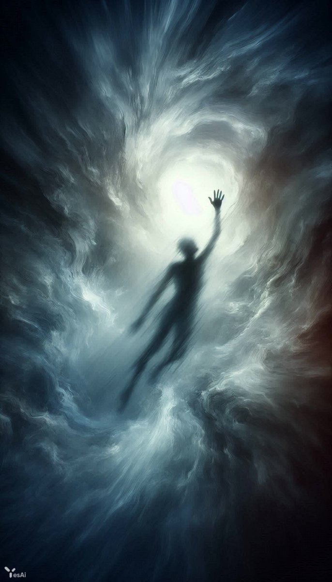 Lost figure, fading silhouette, swirling vortex of air, sense of falling, desperate reach, fractured world imagery, blurred lines between reality and memory, feeling of isolation, struggle against an unseen force, dark blues and grays dominating palette, hints of lost light, a single upward-reaching hand, symbolic representation of drowning, overcoming despair, finding inner strength, subtle textures suggesting fragility and resilience, ethereal quality, melancholic atmosphere. A sense of yearning for connection, the weight of loss, ultimately choosing self-preservation. Artist style: Alphonse Mucha