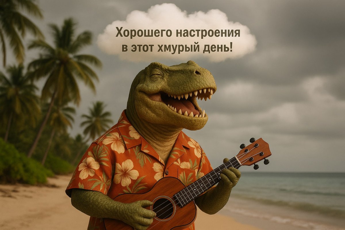 Солнечный островок радости и позитива! Забавный динозавр в яркой гавайской рубашке дарит незабываемую мелодию на укулеле, создавая атмосферу безмятежности и летнего настроения. Над ним плывет пушистое облако с добрым пожеланием – 'Хорошего настроения в этот хмурый день!'. Яркий тропический пейзаж утопает в мягком золотистом свете, а реалистичные текстуры оживляют каждую деталь картины. Это не просто изображение – это портал в мир беззаботности и хорошего самочувствия, где даже самый пасмурный день становится светлее благодаря улыбке динозавра и волшебной музыке укулеле. Погрузитесь в этот красочный уголок тропиков и почувствуйте прилив энергии и оптимизма! Эта картина идеально подойдет для тех, кто ценит юмор, позитив и яркие цвета. Она станет прекрасным украшением интерьера или оригинальным подарком для близких людей, которым хочется подарить частичку солнечного настроения и хорошего расположения духа. Наслаждайтесь атмосферой тепла, радости и безграничной летней свободы!