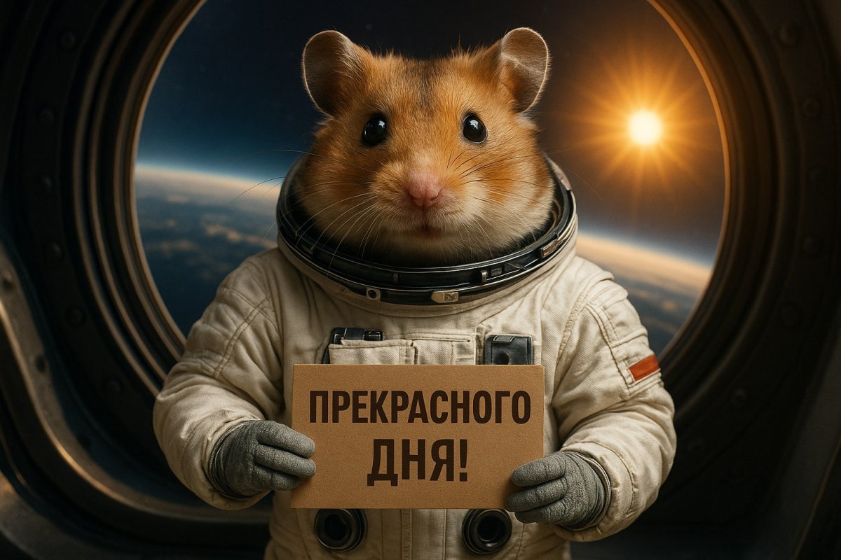 Невероятный фотореализм: хомячок в костюме космонавта, держит табличку с надписью "Прекрасного дня!", фон - вид на Землю из космического корабля, на фоне солнце.