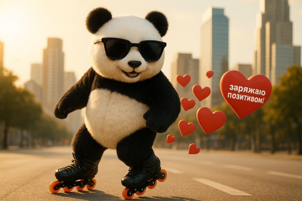 Фотореалистичное изображение: гигантская плюшевая панда в солнечных очках, едет на роликах, за ней тянется шлейф сердец, на одной из них надпись "Заряжаю позитивом!", фон - яркий мягкий солнечный свет и город с небоскребами.