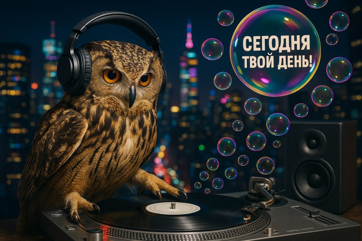 Фотореалистичное изображение: сова-диджей в наушниках крутит винил, а из динамиков вылетают разноцветные пузыри с надписью "Сегодня твой день!", фон – ночной мегаполис с яркими огнями и проекциями на зданиях.