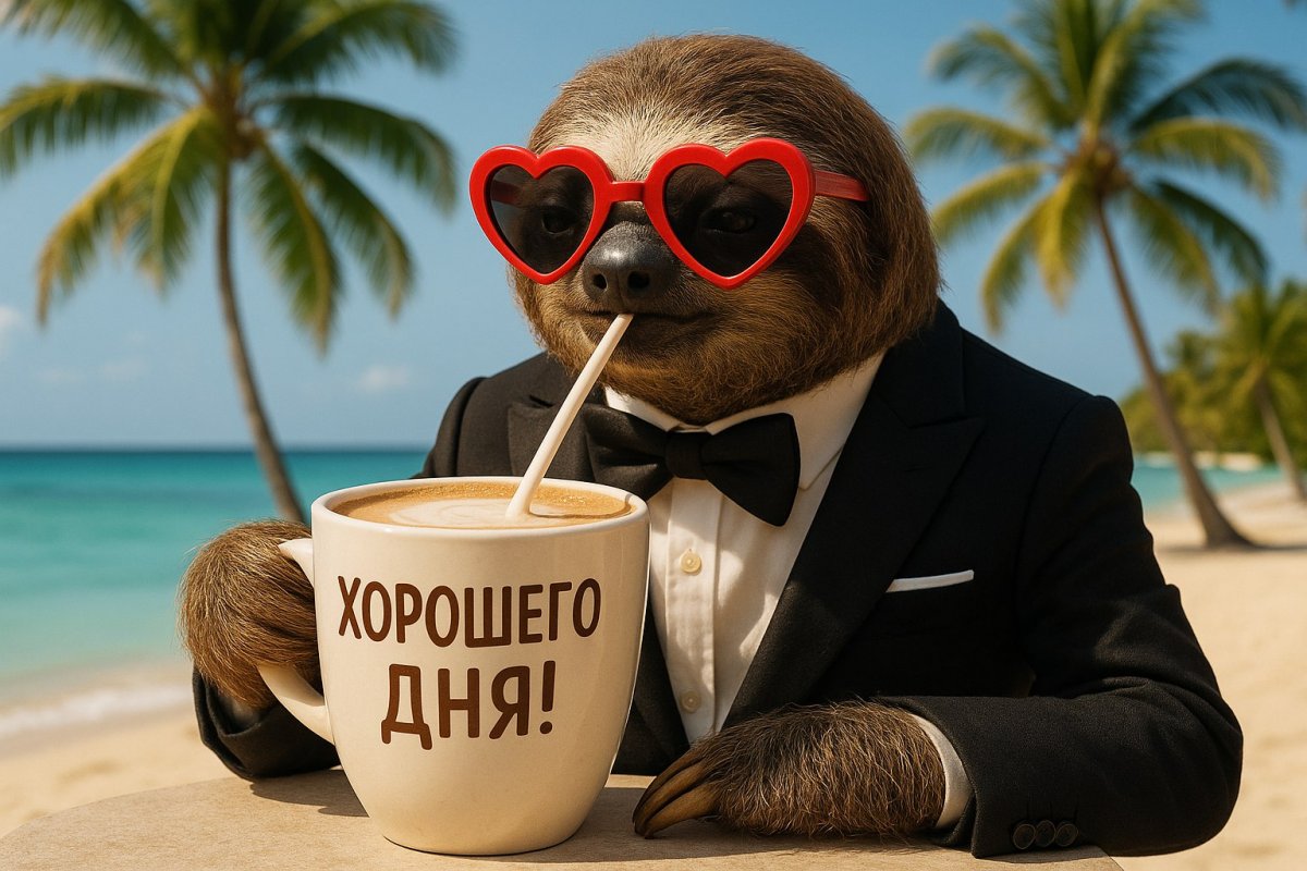 Фотореалистичный кадр: ленивец в смокинге и солнечных очках в виде сердечек с красной оправой и черными стеклами, задумчиво потягивающий капучино из огромной кружки с надписью "Хорошего дня!", фон – тропический пляж в полдень, яркое и мякое освещение, пальмы и море.