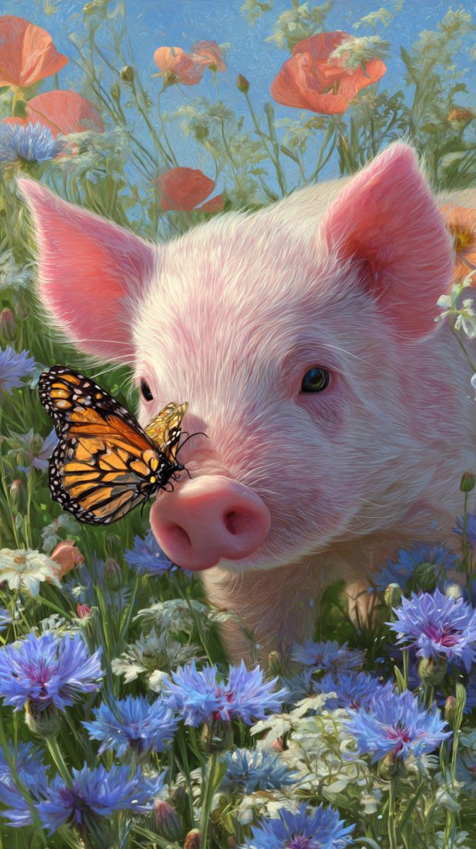 little piglet baby with a butterfly on its nose, close-up, fish eye effect, photo digital art, pixabay, background of a bright flower meadow, incredibly cute, renaissance, national geographic”, desktop wallpaper - 1 0 2 4 --ar 9:16