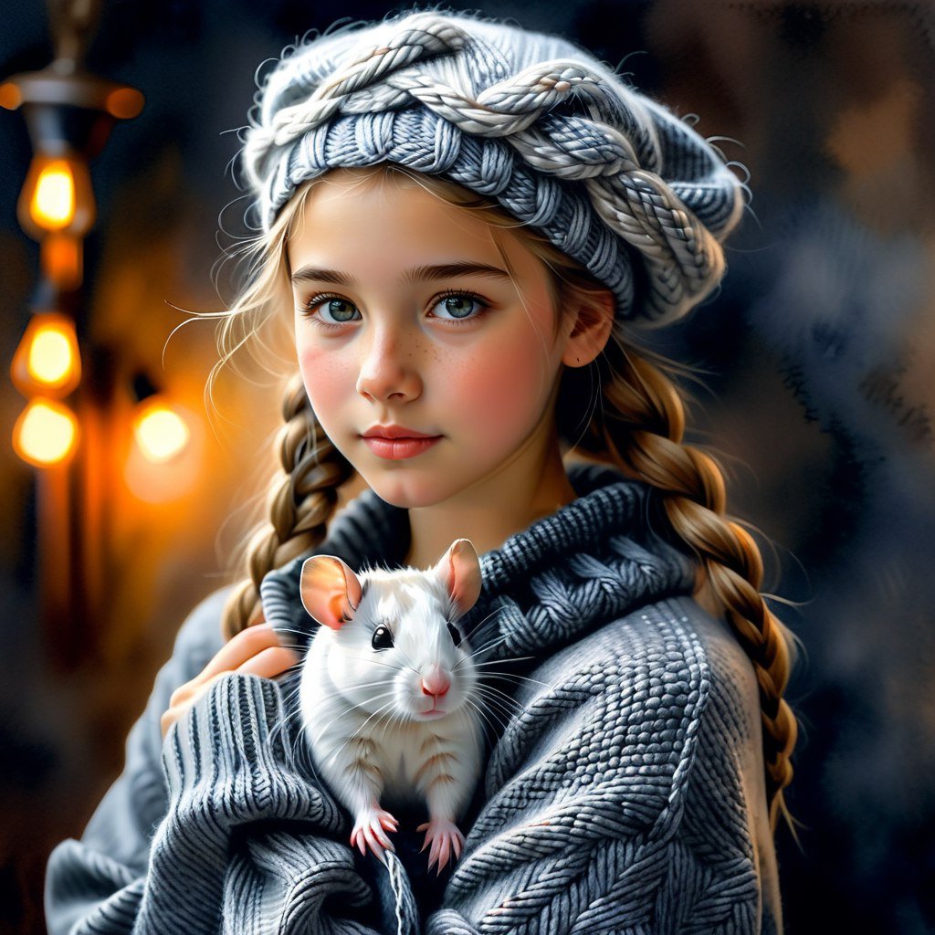Watercolor acrylic random pose a young white girl with braided hair wearing a gray herringbone cap and a dark knitted sweater with a neck. She looks at the viewer affectionately, with a small beige rat sitting on her shoulder, its body resting on her arm. The background is dark and slightly blurred, creating a warm atmosphere. The lighting emphasizes the girl's delicate features and the texture of her clothing.