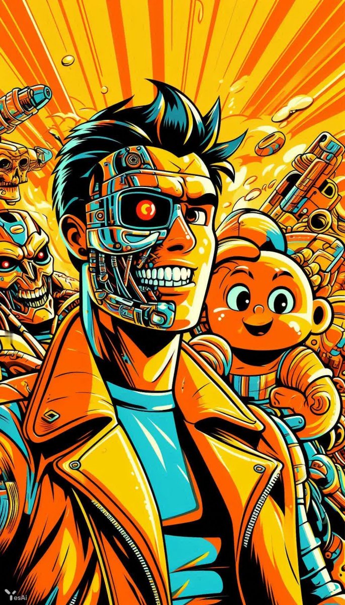 A Cartoon Network Comics Mashup version of Terminator, combining modern animation style with classic comic book elements. Feature bold outlines, expressive characters, and vibrant orange and yellow with playful energy.