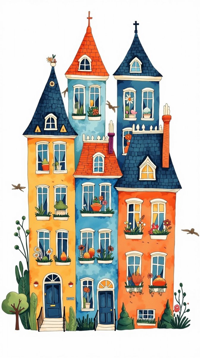 #5. paper cut gouache illustration showcasing row houses on a white background, whimsical designs inspired by mary blair and j. journalists, fantasy house #role_houses