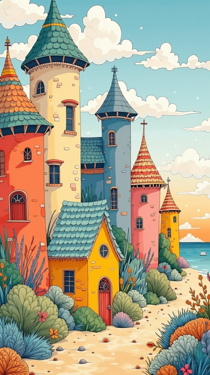 Очаровательная акварельная иллюстрация в технике гоше, выполненная в мультяшном стиле, изображает живописную сцену пляжных домиков. Архитектура зданий выделяется благодаря высоким башням и небольшим окошкам, создающим сказочный облик. Вдохновленная творчеством Наото Хаттори, работа передает атмосферу радости и фантазии. Яркий и красочный фон дополняет общее впечатление легкости и беззаботности, приглашая зрителя окунуться в мир мечтаний о летнем отдыхе на побережье. Изображение пронизано деталями, демонстрирующими мастерство художника и внимание к композиции. Каждый домик уникален, а их совокупность создает гармоничную панораму, наполненную позитивными эмоциями. Этот арт-объект станет прекрасным украшением интерьера или оригинальным подарком для ценителей искусства и любителей морской тематики. Он излучает тепло и уют, напоминая о теплых днях на пляже и безграничных возможностях воображения. Иллюстрация выполнена с использованием мягких пастельных тонов, которые создают ощущение спокойствия и умиротворения