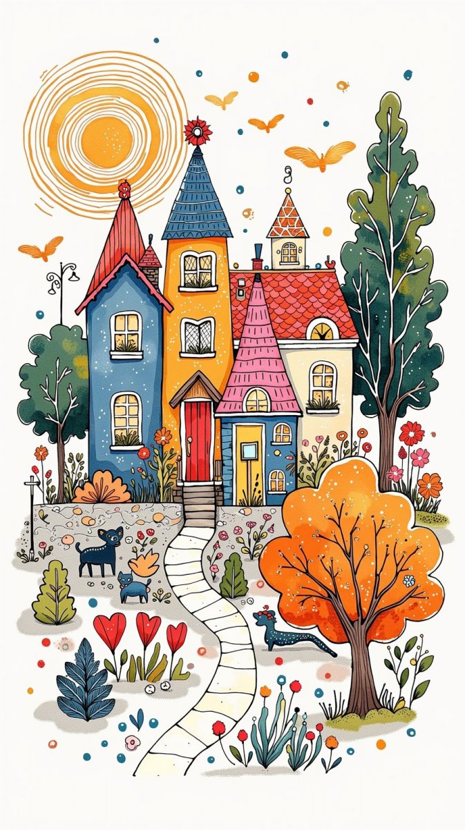 #1. ink drawing, folk art illustration portraying a colorful cartoon village with houses and trees, inspired by thomas kinkade’s style, featuring whimsical patterns and intricate details on a white background #role_houses