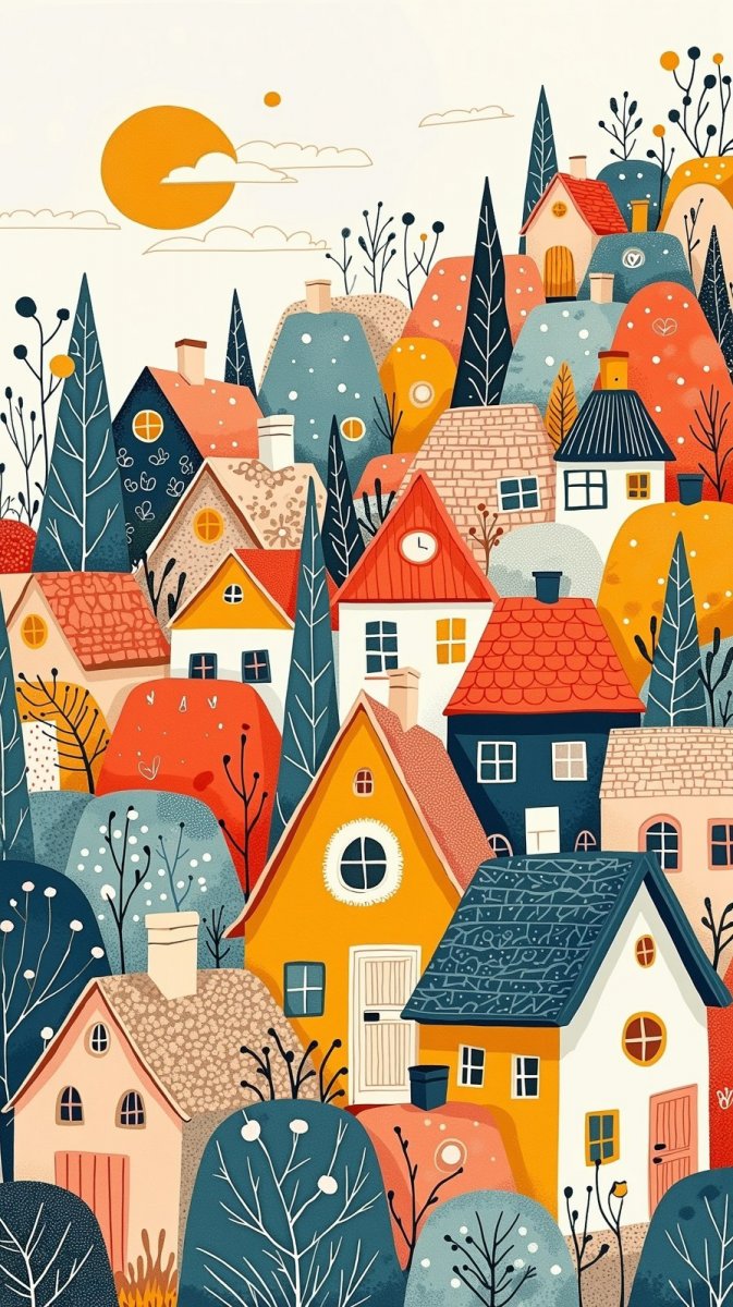 #2. doodling, naive art portraying whimsical cartoon houses on a hillside, inspired by mary blair’s simple strokes with bright colors and intricate details, creating an atmosphere of happiness #role_houses
