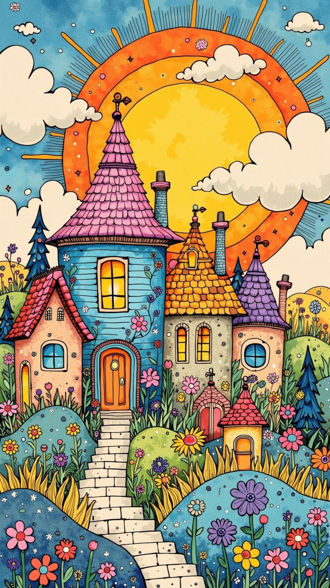 #3. zentangle, illustration, depicting a fantasy background with cute cartoon houses and a cheerful sun rising from behind them, showcasing intricate details reminiscent of Naoto Hattori and Maud Lewis' charm #role_houses