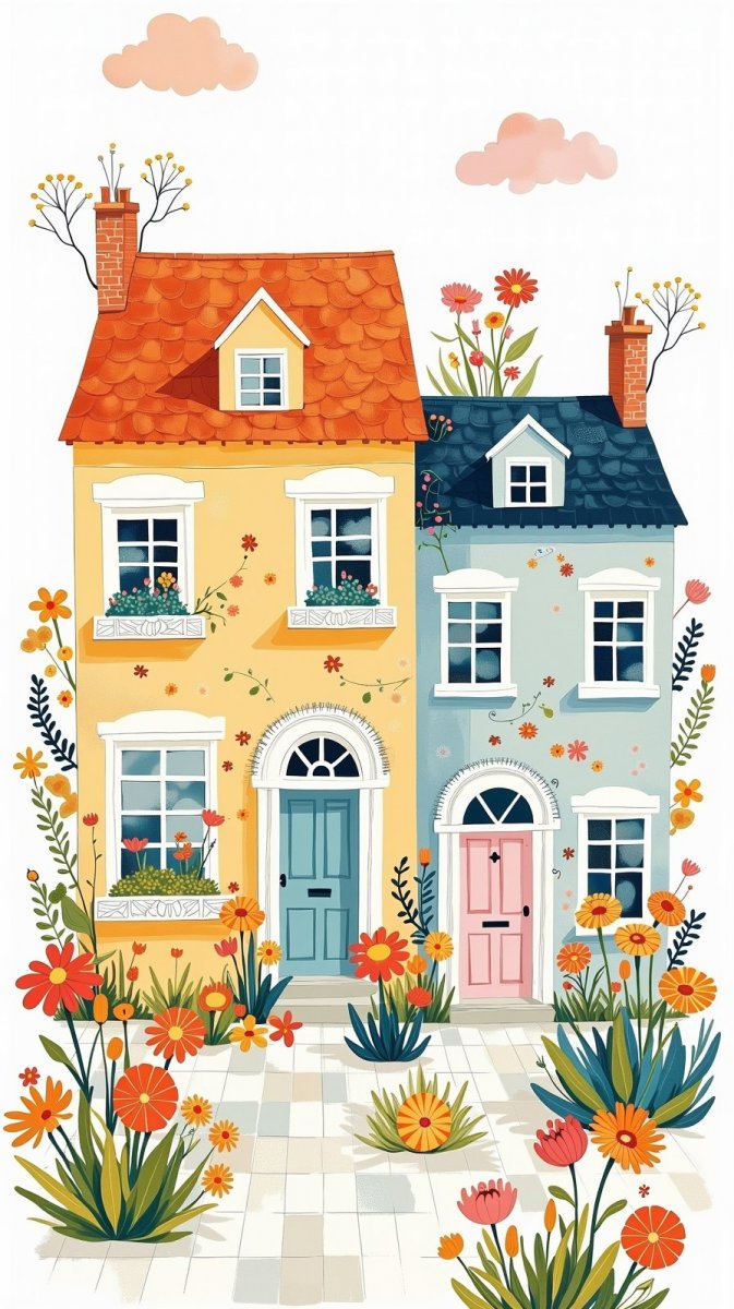#4. paper cut gouache illustration, cartoonish, presenting row houses with flowers in pastel colors on a white background, clean sharp clipart-like imagery, evoking a cozy cottagecore atmosphere in the style of J. Journalists #role_houses