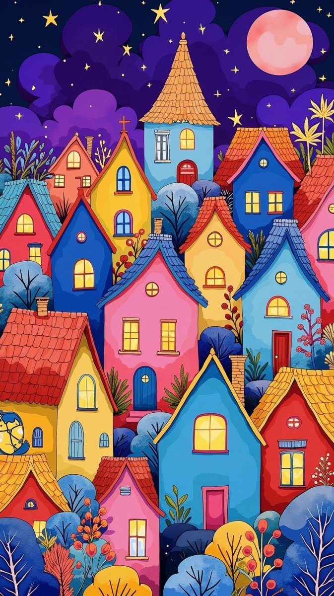 #2. naive art, doodling, depicting cartoon houses in vibrant hues inspired by anna garmashova’s style, set against a purple sky at night, evoking joyous creativity and imagination within a fantasy landscape #role_houses