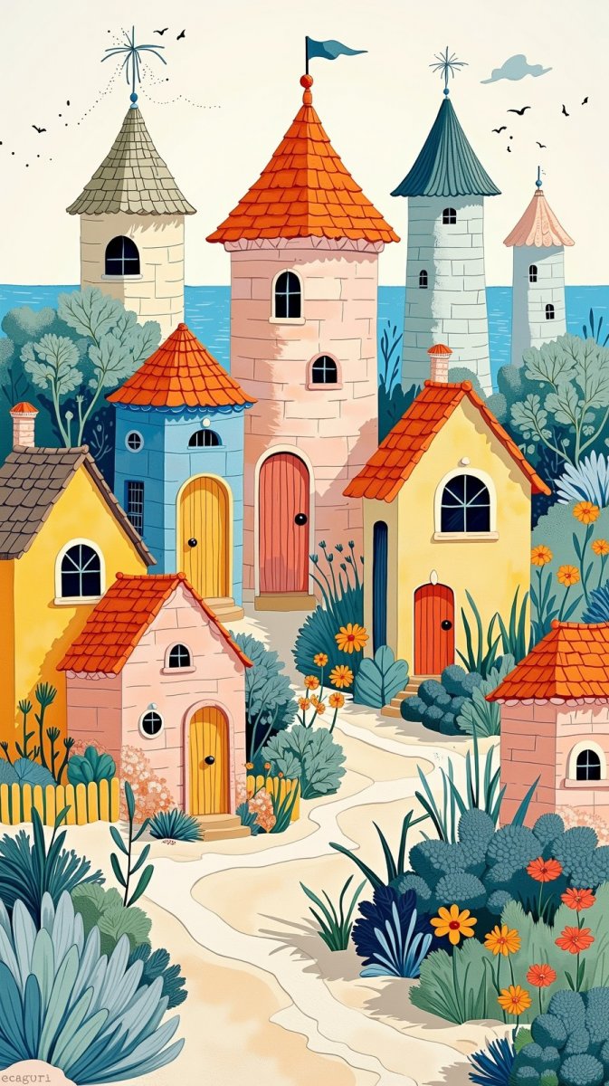 #4. paper cut gouache illustration, cartoonish, showcasing a detailed painting of beach houses with whimsical designs echoing naoto hattori’s elegance, complemented by elements such as tall towers and small windows to convey depth and perspective #role_houses