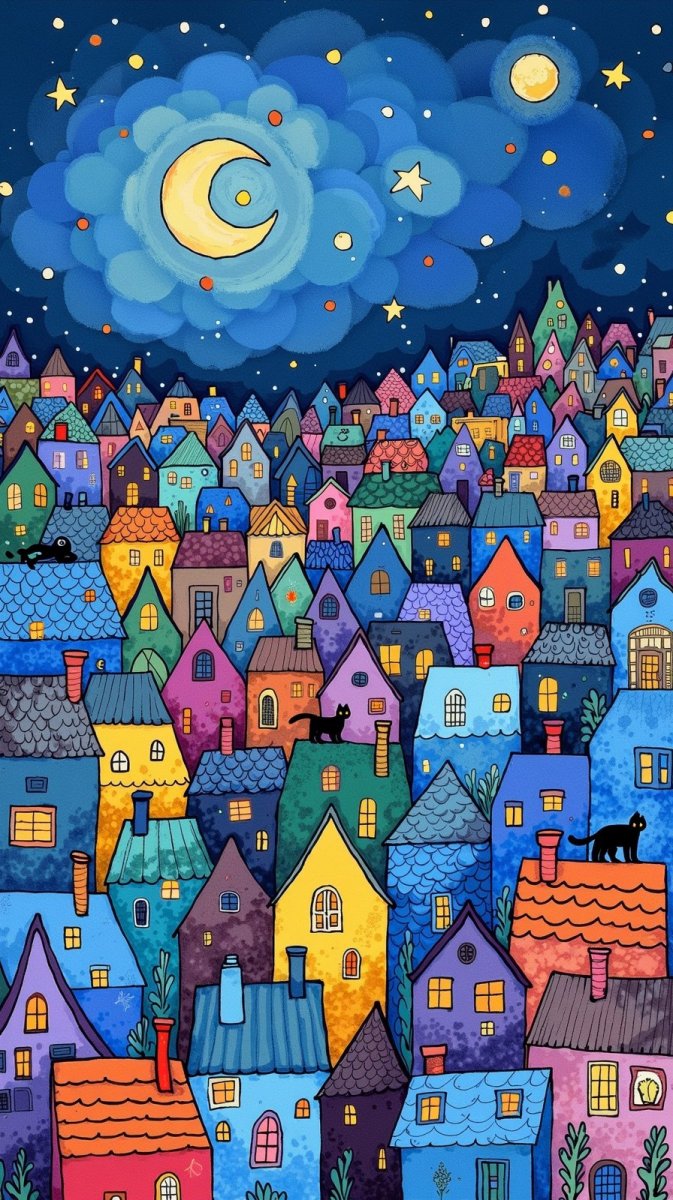 Очаровательный городок, оживший на бумаге в духе народного искусства и дзен-тангла. Эта иллюстрация переносит нас в сказочный мир с мультяшными домиками, вдохновленными творчеством Матисса. Ночная атмосфера создается при помощи нежной палитры синих, фиолетовых и зеленых оттенков, погружая зрителя в атмосферу спокойствия и волшебства. Простота детского рисунка сочетается с изяществом узоров дзен-тангла, образуя уникальное произведение искусства. На крышах домов словно вырезанные силуэты кошек добавляют картине загадочности и домашнего тепла. Это не просто изображение города – это приглашение в мир фантазий, где каждый дом хранит свою историю, а ночное небо усыпано тайнами. Картина излучает мягкое сияние, словно лунный свет освещает тихие улочки. Использование приглушенных тонов создает ощущение уюта и защищенности. Эта иллюстрация – идеальный выбор для тех, кто ценит простоту форм и красоту народной традиции, а также любит все милое и сказочное. Стиль Матисса добавляет работе элегантность и изысканность. Фольклорные мотивы делают ее неповторимой и запоминающейся. Идеально подойдет для оформления детской комнаты или создания атмосферы уюта в любом интерьере, где хочется добавить немного волшебства и тепла