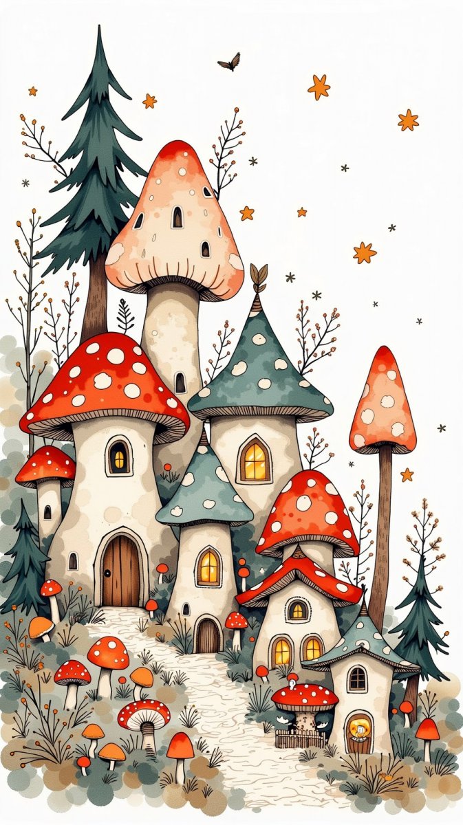 #1. ink drawing, folk art illustration depicting a whimsical forest village with mushroom-shaped houses and glowing windows, inspired by Johanna Basford's intricate detailing and a touch of Thomas Kinkade’s cozy lighting, pastel colors on white background #role_houses