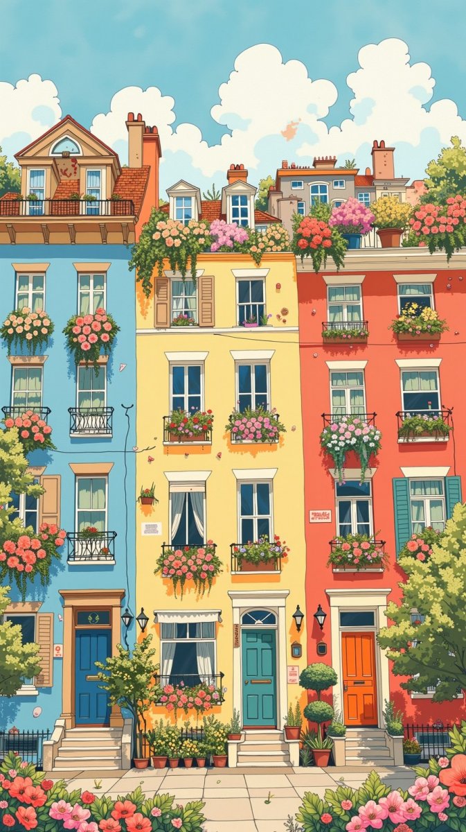 #3. folk art cartoonish illustration portraying a vibrant cityscape filled with pastel-colored row houses adorned with blooming flowers, in the style of J. Journalists with clean lines and sharp clipart imagery #role_houses