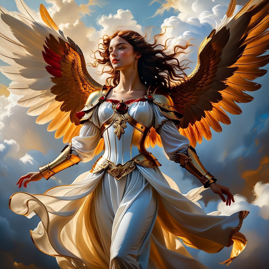 A divine female angel in flight among clouds, rendered as a Renaissance oil painting: ornate bronze and gold armor with fine engravings, layered white and crimson robes flowing in the wind, majestic white feathered wings, serene yet powerful expression, bathed in warm golden light. Balanced composition evoking Raphael and Botticelli, delicate chiaroscuro and soft transitions between light and shadow, intricate textures in fabric and feathers, lifelike anatomy, cinematic realism, rich impasto and glazing, oil on canvas, classical Renaissance painting style, masterpiece, 8K, ArtStation quality - painterly brushwork, subtle color harmony, lumino...