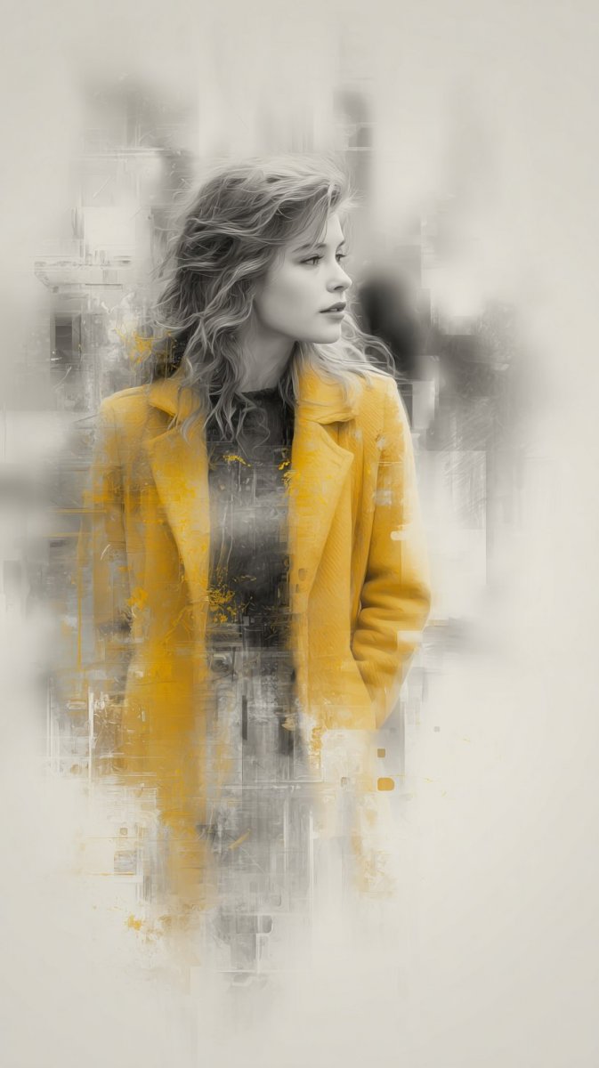 Завораживающий монохромный портрет молодой женщины выделяется ярким акцентом желтого цвета на фоне размытой городской суеты. Минималистичная композиция передает атмосферу задумчивости и отрешенности, когда главная героиня, одетая в стильный желтый плащ, стоит среди нечетких силуэтов толпы. В ее руках – букет ярких желтых цветов, которые контрастируют с приглушенной цветовой палитрой фона. Свободные волны волос добавляют образу легкости и воздушности, а абстрактные формы на заднем плане создают ощущение глубины и загадочности. Это не просто изображение, это запечатленный момент созерцания, когда мир вокруг растворяется в размытых очертаниях, оставляя лишь главное – внутренний мир и красоту момента. Работа выполнена в технике цифрового искусства черно-белое изображение с тщательно подобранным цветовым акцентом создает визуальную гармонию и усиливает эмоциональное воздействие на зрителя. Портрет излучает спокойствие и уверенность, приглашая задуматься о жизни и ее простых радостях. Это произведение искусства – воплощение элегантности, минимализма и тонкого чувства прекрасного. Идеально подойдет для тех, кто ценит изысканный стиль и глубину в изобразительном искусстве