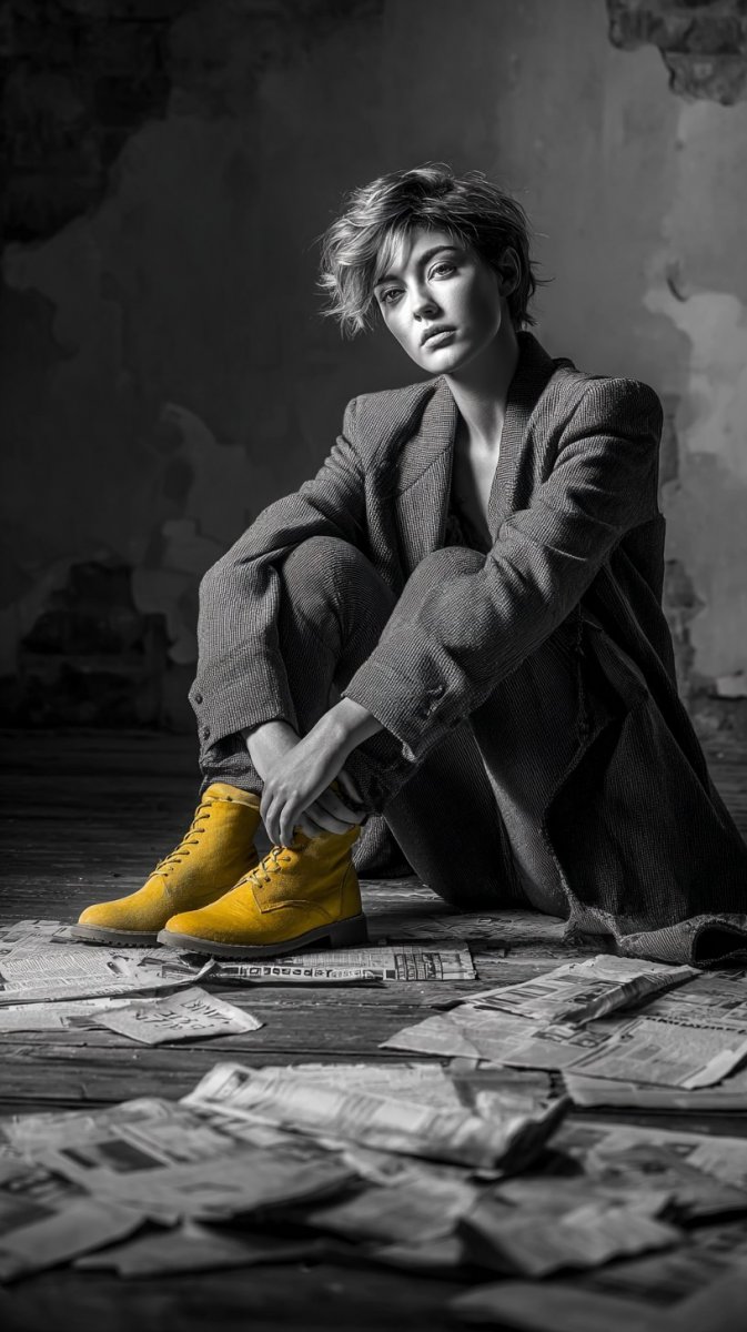 Завораживающая черно-белая иллюстрация в цифровом стиле демонстрирует минималистичный портрет молодой женщины. Ее задумчивый взгляд приковывает внимание зрителя, а строгий наряд лишь подчеркивает лаконичность композиции. Женщина сидит на полу, окруженная пожелтевшими вырезками из газет, создавая ощущение ностальгии и погруженности в воспоминания. Фон представляет собой текстурированную стену, которая добавляет глубины и объема изображению. Яркий акцент – пара ослепительно-желтых туфель – выделяется на фоне монохромной гаммы, привнося в картину динамизм и неожиданный контраст. Стиль raw подчеркивает естественность и неприукрашенность изображения, позволяя сосредоточиться на эмоциях и деталях. Это не просто портрет, это зарисовка момента, передающая атмосферу размышлений и внутренней гармонии. Композиция отличается своей сдержанностью и элегантностью, каждый элемент тщательно продуман для создания единого целостного образа. Использование черно-белой палитры усиливает драматизм и подчеркивает игру света и тени, придавая изображению особую выразительность. Сочетание простоты формы и яркого цветового акцента делает эту работу запоминающейся и привлекающей внимание. Художественный стиль raw позволяет ощутить подлинность момента и соприкоснуться с внутренним миром модели. Это визуальное исследование темы одиночества, размышлений и поиска себя в окружающем мире, воплощенное в лаконичном и выразительном образе