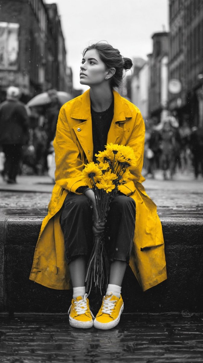 monochrome, bw digital art, bright yellow accent on sneakers, minimalistic, black and white portrait of woman in bright yellow coat, surrounded by blurred people, holding yellow flowers, thoughtful expression, BG is busy city street