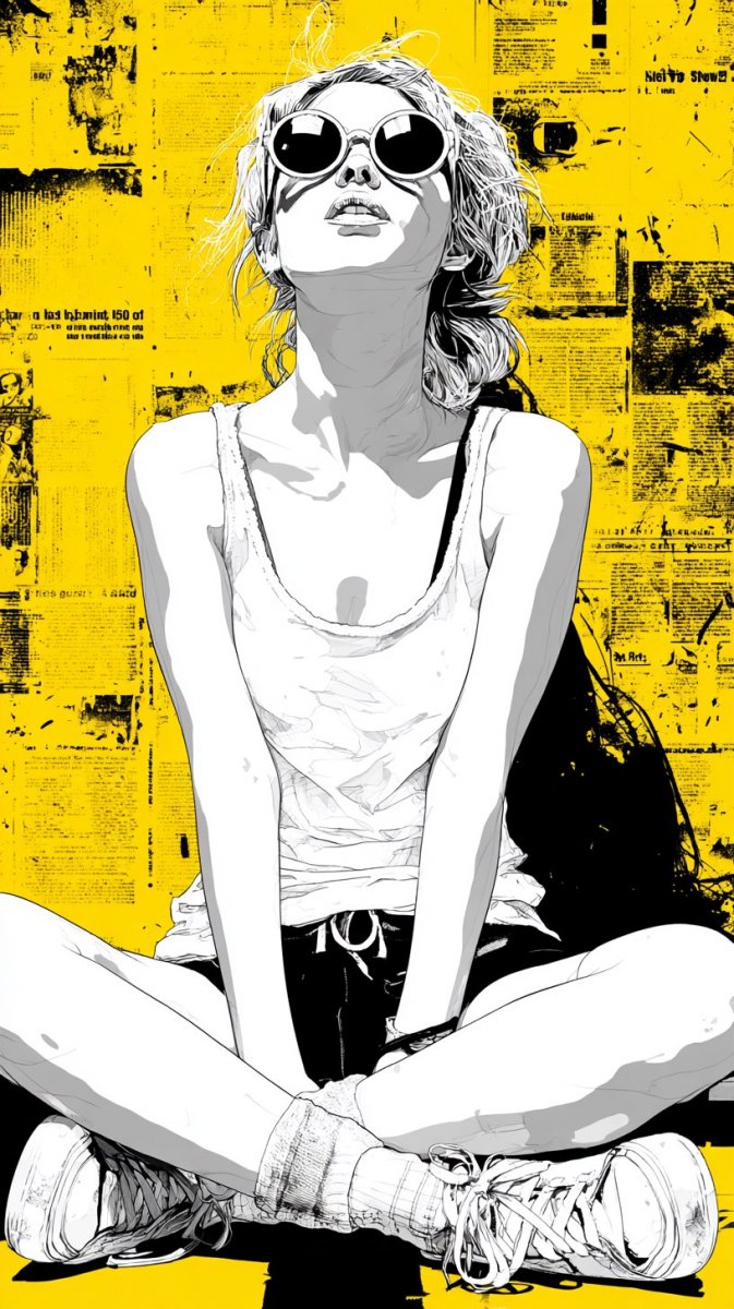 Монохромная цифровая иллюстрация в черно-белых тонах с ярким акцентом желтого цвета на кроссовках. Минималистичная композиция изображает молодую женщину, сидящую на полу перед стеной, усыпанной обрывками газетных вырезок. Она одета в черную водолазку и белые шорты, ее короткие светлые волосы обрамляют лицо, а большие желтые солнцезащитные очки скрывают взгляд. Женщина смотрит вверх с широко открытым ртом, словно удивленно наблюдая за происходящим. Контраст между черно-белым фоном и ярким цветом обуви привлекает внимание к деталям и создает ощущение динамики и энергии. Простота формы и отсутствие лишних деталей подчеркивают современный стиль изображения. Общий эффект – это стильная и запоминающаяся фотография, сочетающая в себе элементы моды, искусства и повседневной жизни. Изображение передаёт атмосферу спокойствия и созерцательности, позволяя зрителю погрузиться в мир минимализма и эстетической чистоты. Яркий желтый цвет добавляет нотку игривости и оптимизма, делая изображение более привлекательным и запоминающимся. Композиция выигрышно смотрится благодаря правильному распределению света и тени, создавая объемные формы и подчеркивая текстуру поверхностей. Это произведение искусства – отличный пример современного цифрового творчества, сочетающего в себе техническое мастерство и художественное видение