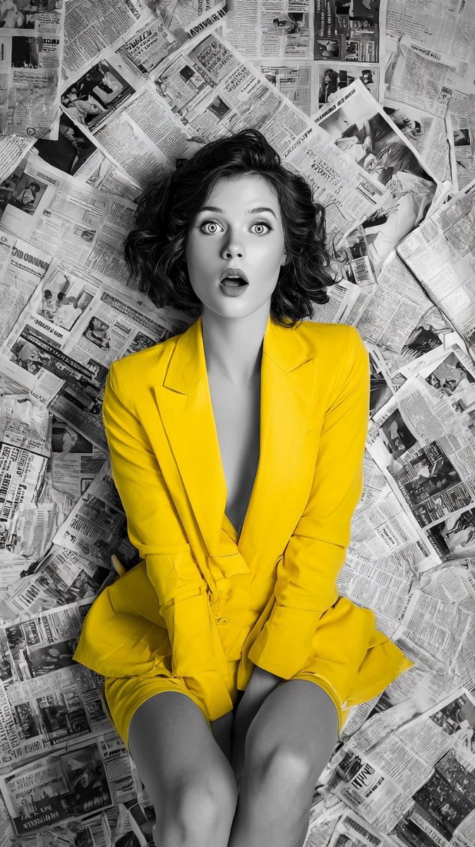 monochrome, bw digital art, bright yellow accent, minimalistic young woman wearing checked blazer, sitting with eyes wide and mouth open in surprise, surrounded by black and white newspaper articles --style raw