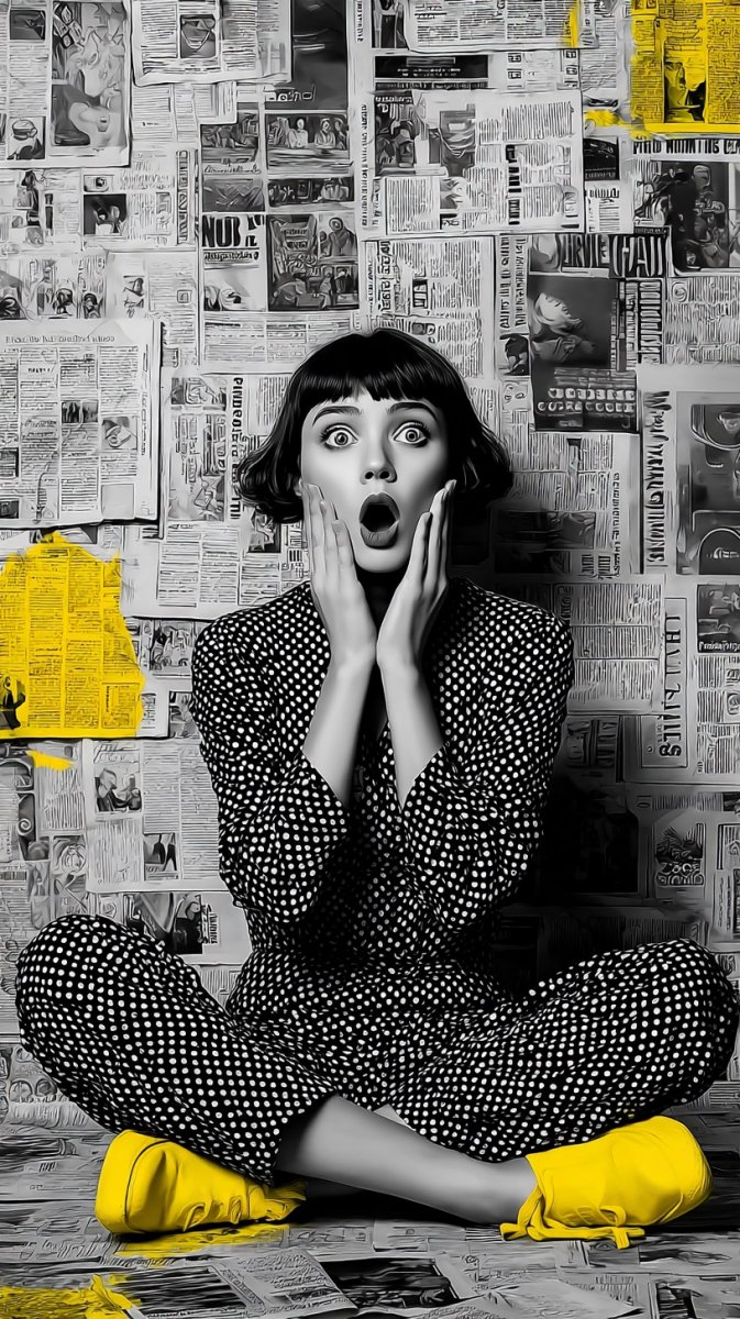 Монохромный цифровой арт захватывает взгляд динамичным сочетанием черно-белой палитры и яркого акцента в виде желтых кроссовок. В центре композиции – молодая женщина, сидящая на полу перед стеной, увешанной вырезками из газет. Ее образ подчеркнут лаконичностью: черные и белые полоски комбинезона, короткая стрижка боб создают ощущение современной элегантности. Выражение удивления на лице, руки, приподнятые к лицу, добавляют сцене эмоциональной глубины и загадочности. Фон заполнен хаотичным коллажем из газетных заголовков и статей, что создает эффект погружения в мир информации и новостей. Это не просто визуальный образ – это история, рассказанная через игру света и тени, цветовую гамму и мимику модели. Картина вызывает ощущение моментальной зарисовки, фотографии из жизни, запечатленной с особым вниманием к деталям. Контраст между монохромным фоном и ярким акцентом на обуви привлекает внимание и подчеркивает индивидуальность героини. Композиция словно приглашает зрителя разгадать тайну этого момента, почувствовать атмосферу неожиданности и соприкоснуться с миром газетных новостей, оживших в художественной интерпретации. Эта работа – визуальный манифест современности, сочетающий в себе элементы моды, искусства и медиа
