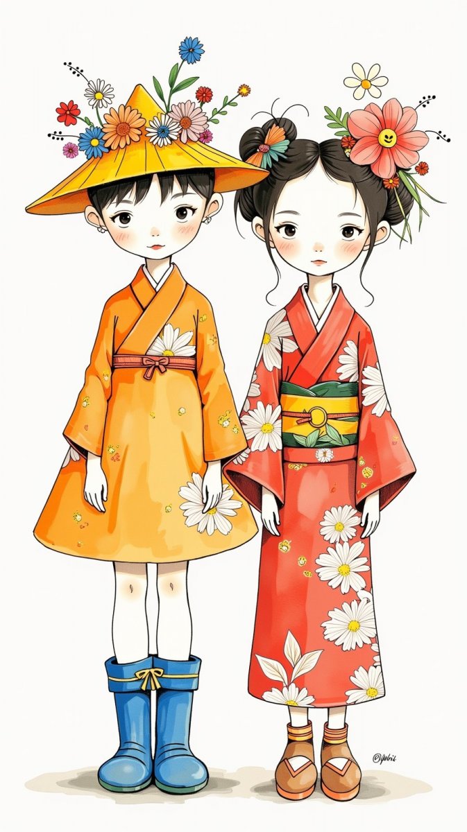 #1. ink drawing of two young girls standing side by side in colorful outfits, one wearing an orange dress with blue boots and a large yellow hat adorned with colorful flowers, the other in a red kimono, against a white background with simple shapes and exaggerated features, look at the viewers. #role_Illustration