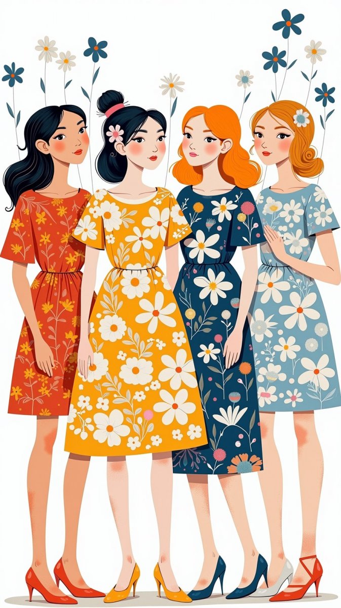 #4. folk art paper cut gouache illustration of four young women in different colorful outfits, one donning a floral-patterned dress and another in high heels, simple shapes and primitive figures against a white background with scattered blue flowers, engaging with the viewers. #role_Illustration
