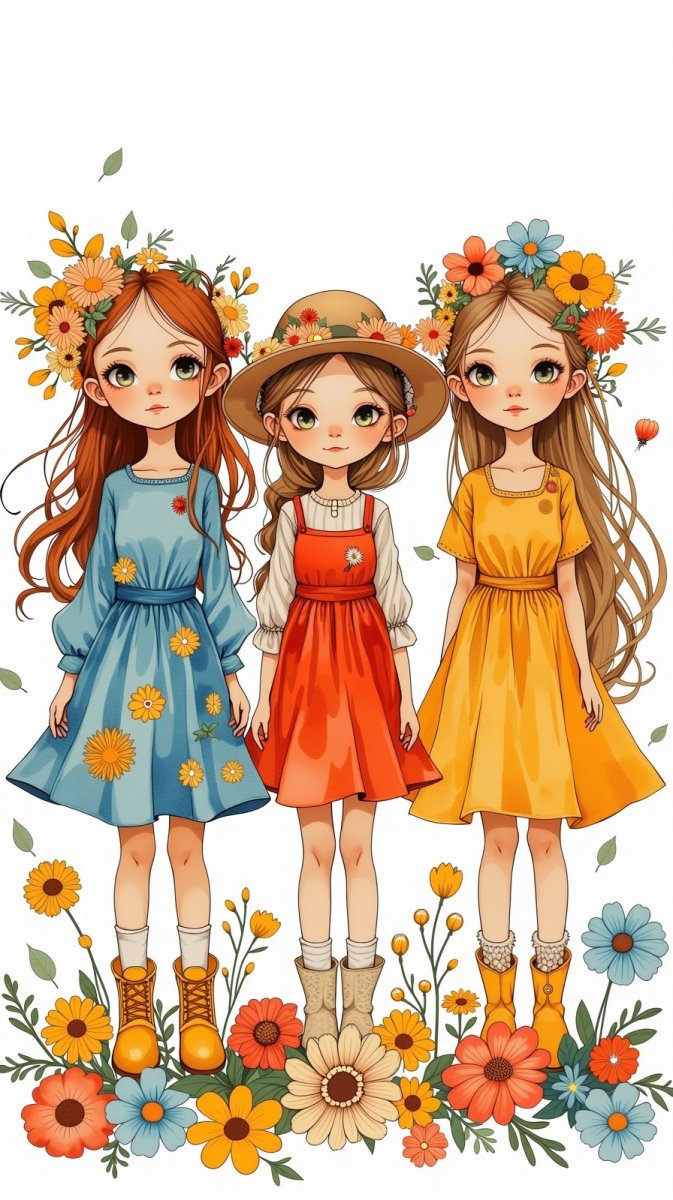 #3. cartoonish doodling of three young girls illustrated side by side, the girl on the left in a blue dress with yellow flowers and boots, the middle in a red dress with a floral hat, and another in vibrant colors, all with long hair, surrounded by flowers, look at the viewers. #role_Illustration