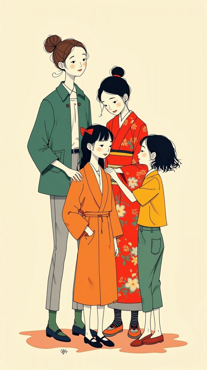 #2. naive art illustration featuring four young women in various brightly colored clothing, including one with a green jacket and another in a red kimono, set in a minimalist style against a light beige backdrop, interacting playfully with the viewers. #role_Illustration