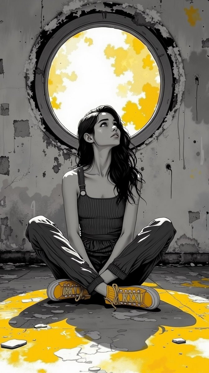 В черно-белом цифровом искусстве выделяется яркий акцент желтого цвета на кроссовках молодой женщины, погруженной в размышления. Она сидит скрещенными ногами на полу заброшенной комнаты, одетая в полосатый комбинезон и устремив взгляд вверх, на круглое окно. Окружающий ее интерьер пронизан атмосферой запустения: облупившаяся краска на стенах и тусклое освещение создают ощущение одиночества и отрешенности. Контраст между монохромной палитрой помещения и вспышкой яркого желтого акцента привлекает внимание к деталям кроссовок, подчеркивая их современный дизайн в контексте заброшенного пространства. Вся композиция создает глубокую эмоциональную атмосферу, сочетая меланхолию увядания с надеждой и размышлениями, отраженными в выражении лица девушки, смотрящей на свет из окна. Эта работа – визуальное исследование темы одиночества, памяти и поиска смысла в забытом месте, где прошлое переплетается с настоящим, а яркий цвет становится символом надежды среди серости запустения. Композиция отличается вниманием к деталям и умелым использованием света и тени для создания драматического эффекта, усиливающего эмоциональное воздействие на зрителя