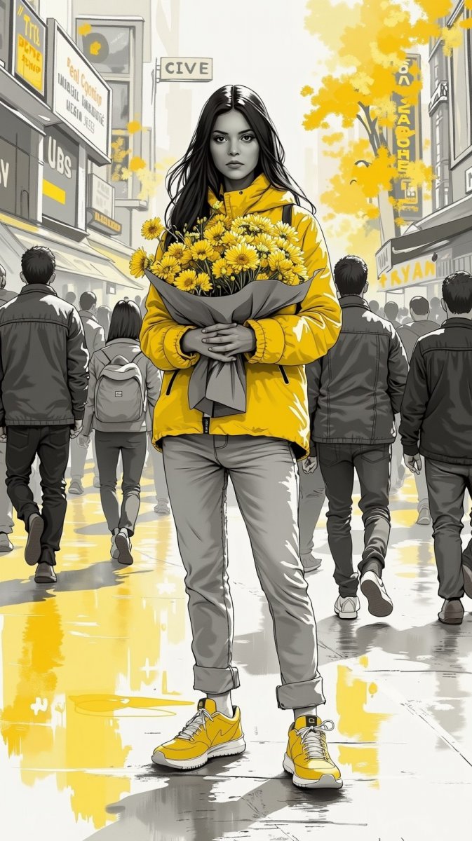 Изящный портрет женщины, запечатлённый в монохромной цифровой графике, выделяется ярким жёлтым акцентом на её обуви. Она держит в руках букет солнечных цветов, а на её лице читается серьёзное выражение, направленное прямо в камеру. Вокруг неё царит оживлённая атмосфера многолюдной городской улицы, где размытые фигуры пешеходов создают ощущение непрекращающегося движения и суеты. Этот контраст между спокойной сосредоточенностью героини и динамичным фоном подчеркивает её внутренний мир и выделяет её из толпы. Жёлтый цвет в деталях обуви и цветов символизирует радость, оптимизм и индивидуальность, добавляя портрету особую выразительность и эмоциональную глубину. Композиция картины создаёт ощущение моментальной зарисовки, словно мы случайно стали свидетелями этой сцены на оживлённой городской улице, где каждый человек несёт свою историю и живёт своей жизнью. Акцент на жёлтом цвете притягивает взгляд и добавляет портрету законченности и гармонии, делая его запоминающимся и вызывающим сильные эмоции у зрителя. Это не просто фотография, а художественное произведение, отражающее красоту момента и силу человеческого духа в условиях городской суеты