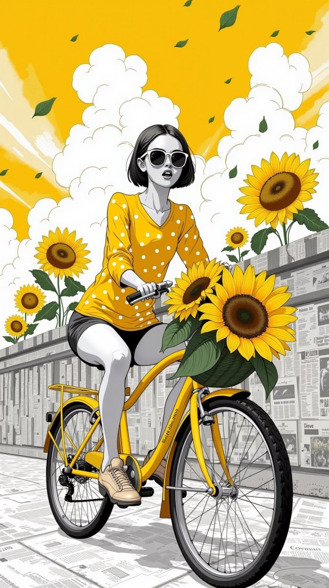 Яркая и сюрреалистичная цифровая картина в монохромной гамме передает ощущение игривости и внезапного удивления. В центре композиции – женщина, восседающая на велосипеде насыщенного желтого цвета, украшенном огромными подсолнухами, прикрепленными к переднему колесу. Её образ подчеркнут коллажным сочетанием: одежда в горошек, короткая стрижка боб, стильные солнцезащитные очки. Женщина сидит на полу перед стеной, полностью оклеенной вырезками из газет – это создает эффект хаотичного визуального фона, добавляя глубину и сложность изображению. Выражение её лица – смесь удивления и веселья, глаза широко раскрыты, словно она кричит или корчит рожицу от неожиданности. За ней простирается небесный пейзаж: пасмурное небо с пушистыми белыми облаками, над которыми парят причудливые структуры, напоминающие подсолнухи – это добавляет картине элемент фантазии и нереальности. Сочетание монохромной техники, яркого желтого акцента и неожиданных деталей создает уникальную атмосферу, полную юмора и сюрприза, приглашая зрителя погрузиться в этот странный, но захватывающий мир. Картина излучает позитив, энергию и некую абсурдность ситуации, заставляя задуматься о скрытых смыслах и интерпретациях происходящего на изображении. Это визуальный рассказ, полный загадок и ярких эмоций, где реальность переплетается с фантазией в причудливом танце цвета и формы