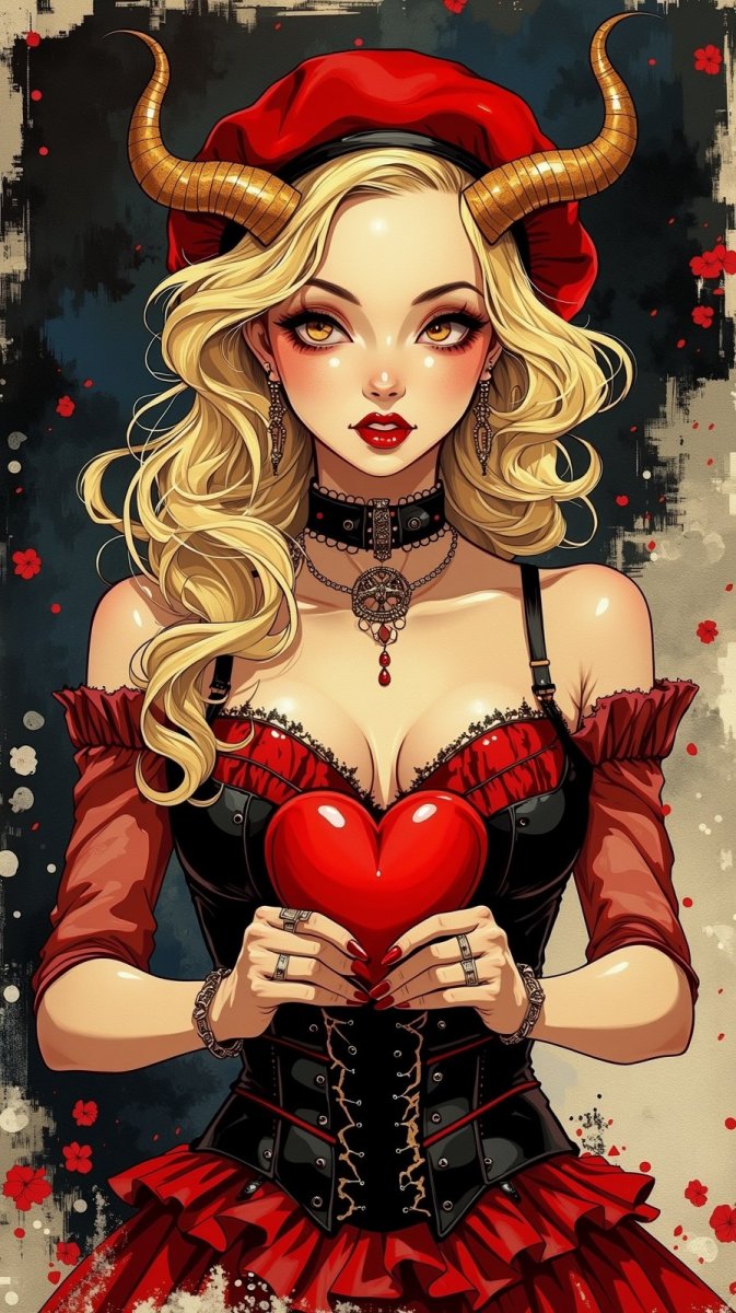 #4. a professional photo of an emotional blonde bimbo fit in a black-red dress with a corset, red beret, ring earrings, bright scarlet lips, long eyelashes, holding a scarlet heart, shiny horns on the head, burlesque style, abstract shadows and double exposure layers on a darkened background #role_real