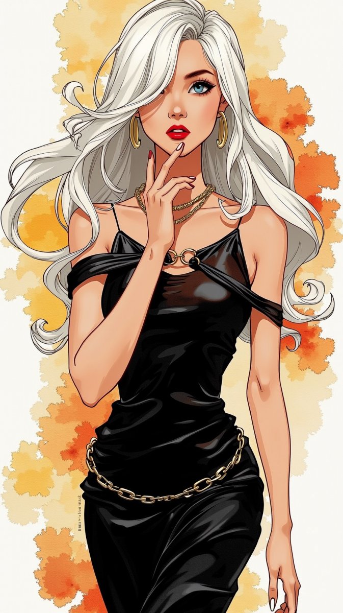 Завораживающая цифровая иллюстрация воплощает образ загадочной и утонченной женщины. В центре внимания – изящная модель в элегантном черном платье, подчеркивающем ее силуэт. Акцент на деталях создает неповторимый стиль: ярко-красный лак на ногтях добавляет дерзости и выразительности, а длинные волнистые белые волосы, ниспадающие мягкими локонами вокруг лица, придают образу неземную красоту и легкую меланхолию. Изящное золотое колье завершает ансамбль, подчеркивая благородство и статус героини. Общая атмосфера произведения пропитана темнотой и таинственностью, создавая ощущение интриги и скрытых желаний. Это не просто портрет – это погружение в мир грез и фантазий, где красота сочетается с загадкой, а чувственность переплетается с элегантностью. Цифровое искусство раскрывает глубину эмоций и создает неповторимый визуальный опыт, заставляя зрителя задуматься о природе красоты и женственности. В каждой линии и каждом оттенке чувствуется мастерство художника, сумевшего передать сложный характер и настроение модели. Картина вызывает ощущение легкой тревоги и притягательности одновременно, оставляя неизгладимое впечатление в душе зрителя. Это произведение – манифест современной эстетики, сочетающий в себе классические элементы и инновационные технологии