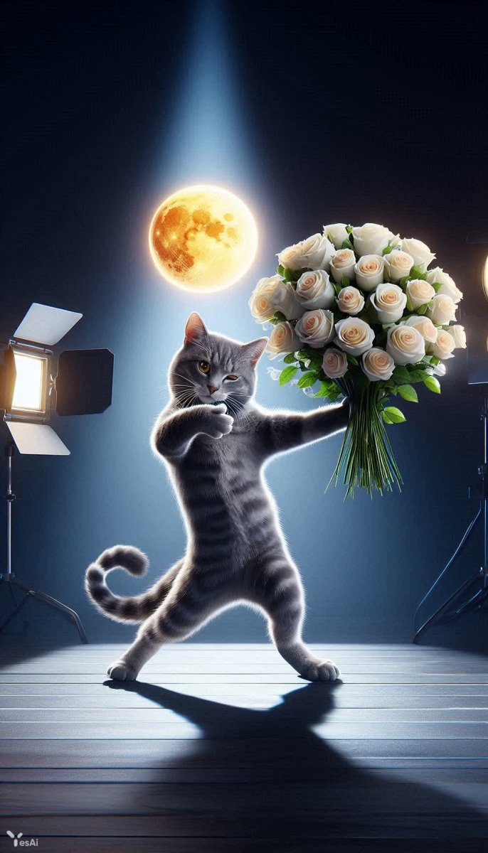An anthropomorphic gray tabby cat dances a modern professional R'n'B dance, then he stands before our eyes and grabs with his paws somewhere above, outside the frame, first the Sun, shows us, then the Moon, and then somewhere off to the side, outside the frame, he takes out a large bouquet of white roses and holds it out directly to the camera, winks with one eye, realistic, cinematic, cinematic professional lighting
